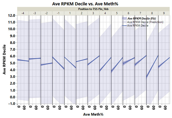 Within ±1 kb of the TSS, there was a weak negative correlation between the average percentage of DNA methylation and gene transcription expression deciles (Figure 6, correlation multivariate = −0.1780, p < 0.0001, nonparametric Spearman’s correlation = −0.1954, p < 0.0001). This inverse relationship between gene expression decile and DNA methylation in the ±1 kb flanking TSS is further demonstrated in Figure 7. The average percent DNA methylation within ±1 kb of genes’ TSS at the first decile of the expression range was 38.6%, compared to 23.5% in the 10th decile (Figure 7).
