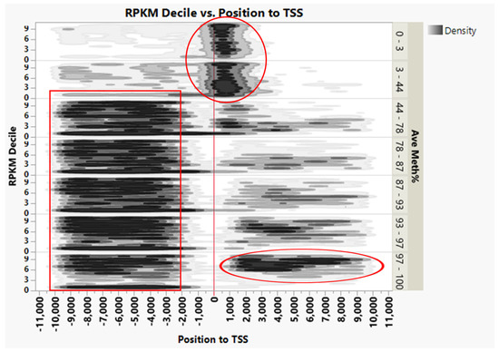 In addition, an increased percentage of hypermethylated CGIs (>97%) was noticed in the gene body (+2 to +10 kb) of the highly expressed genes (> 6 deciles). Moreover, most CGI in −2 to −10 upstream of genes were moderate- to hyper-methylated (>44%), regardless of gene expression (Figure 8).