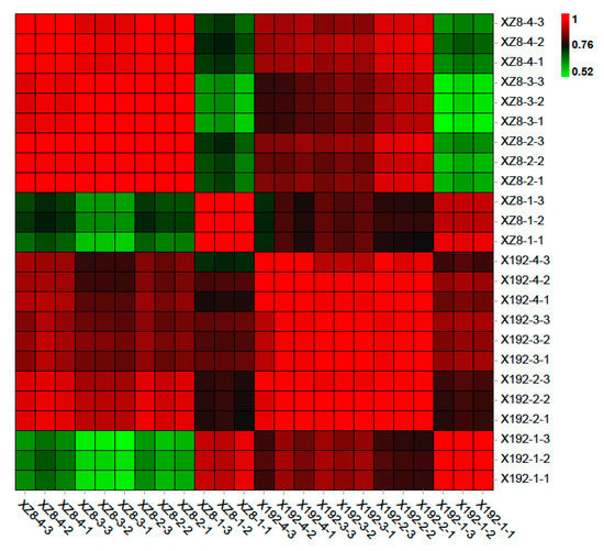 Based on the results of the expression quantity of each sample, principal component analysis (PCA) and heatmap were used to reveal the repeatability between samples and the correctness of sequencing. Using R (http://www.r-project.org/, accessed on 9 August 2021) to carry out PCA, the distance relationship between samples was studied with the purpose of dimensionality reduction [26]. This method can effectively find the most major elements and structures in the data by means of variance decomposition, and reflect the complex sample composition relationship to the two characteristic values of the horizontal and vertical coordinates, so as to achieve the effect of finding the 24 samples’ aggregation rule from the sequencing data (Figure S1). As shown in Figure S1, the biological replicates from the same treatment group were highly correlated, only X192-4 showed as slightly less correlated. The results of the heatmap coincided with our PCA and visually showed the correlation between 24 samples in the form of a heatmap (Figure 2). In addition, the results showed that XZ8-2, XZ8-3 and XZ8-4 were highly correlated, which means that the gene expression profiles in the three stages were closer (Figure S1 and Figure 2).