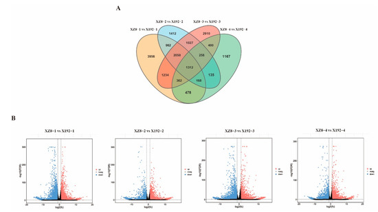 Total number of DEGs in XZ8 and X192 in the four groups. (A) Venn diagram of DEGs in XZ8 and X192 in the four groups (XZ8-1 vs. X192-1, XZ8-2 vs. X192-2, XZ8-3 vs. X192-3 and XZ8-4 vs. X192-4). The numbers in each circle represent the number of DEGs in the corresponding group. The overlapped part of the circle represents the common DEGs between the groups. (B) Volcano plots of XZ8 and X192 in the four groups. The x-axis represents log base two-fold change, the y-axis represents –logbase 10 Q-value (p-adjusted) for each plot. The DEGs were indicated by the red dots (up-regulated) and the blue dots (down-regulated), and genes without significant difference were indicated by the gray dots.