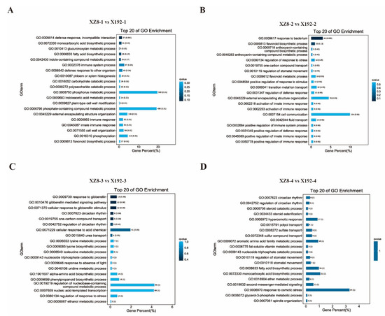 To provide further insight into which pathways the DEGs involved, DEGs were mapped to each item of the GO database (http://www.geneontology.org/, accessed on 9 August 2021). Ggplot2 software was used to calculate the number of DEGs and categorize DEGs in the GO enrichment analysis [27]. Based on the GO categories, obtained using gene list differences in GO function statistics, the top 20 GO enrichment terms of the four groups (XZ8-1 vs. X192-1, XZ8-2 vs. X192-2, XZ8-3 vs. X192-3 and XZ8-4 vs. X192-4) were listed (Figure 4). It should be noted that DEGs in the four groups were significantly enriched in different processes. The DEGs in XZ8-1 vs. X192-1 were significantly enriched in two processes: ‘phosphorus metabolic’ and ‘phosphate-containing compound metabolic’ (Figure 4A). A total of 154 DEGs in XZ8-2 vs. X192-2 were classified as ‘cell communication’ (Figure 4B). The DEGs in XZ8-3 vs. X192-3 and XZ8-4 vs. X192-4 were found to be mainly involved in the ‘regulation of nucleobase-containing compound metabolic process’, ‘nucleic acid-templated transcription’ and ‘response to osmotic stress’, respectively (Figure 4C,D).