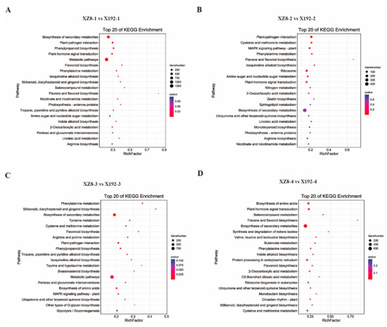 The top 20 of KEGG enrichment pathways in XZ8 and X192 in the four groups. (A–D) XZ8-1 vs. X192-1, XZ8-2 vs. X192-2, XZ8-3 vs. X192-3 and XZ8-4 vs. X192-4. The y-axis is the pathway, and the x-axis is the percentage of this pathway of the total Rich Factor. The color depth represents the Q value. The darker the color, the smaller the Q value and the higher the enrichment degree. The size of the dots indicates the number of DEGs in this pathway.