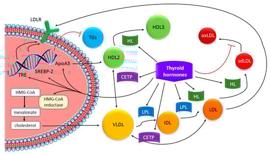 Effects of thyroid hormones on lipid metabolism. Figure modified from [57]. ApoA5, apolipoprotein A5; CETP, cholesteryl ester transfer protein; HDL, high-density lipoprotein; HL, hepatic lipase; HMG-CoA, 3-hydroxy-3-methylglutaryl coenzyme A; IDL, intermediate-density lipoprotein; LDL, low-density lipoprotein; LDLR, LDL receptor; LPL, lipoprotein lipase; oxLDL, oxidized LDL; SREBP-2, sterol regulatory element-binding protein-2;TGs, triglycerides; TRE, thyroid response elements; VLDL, very low-density lipoprotein.