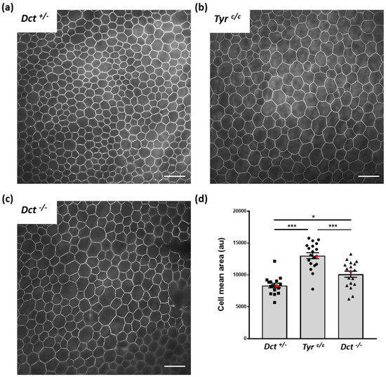 RPE cell size and shape at P0.5. Total RPE flat mounts (for each genotype n = 6; 2 RPEs from 3 mice) were labeled with Alexafluor 488 phalloidin (see whole samples at low magnification, Figure S3), and contiguous images of the whole surface were acquired through a ×40 oil immersion lens for one representative eye per genotype, scale bar: 25 μm. A representative image for each genotype is shown. (a) Dct+/− used as wild-type littermate control; (b) Tyrc/c used as age-matched non-littermate albino control displaying bigger cells than Dct+/−; (c) Dct−/− also displaying bigger cells than Dct+/−; (d) the cell size distribution and average were estimated by manually scoring all cells in each contiguous images from both left and right RPEs of one animal per genotype (number of fields: Dct+/− n= 16, Tyrc/c n= 19, Dct−/− n= 18). The deduced average cell size was plotted for each field. Red symbols correspond to the mean values calculated from selected fields in 4a, 4b, and 4c. The mean ± SEM is indicated by histograms. Significance of differences between groups was determined by one-way ANOVA followed by the Bonferroni post-hoc multiple comparison test, * p < 0.05; *** p < 0.001.