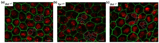 P-cadherin labeling of newborn (P0.5) RPE. RPE flat mounts were immunostained with anti-P-cadherin antibodies that label the adherens junctions in green, scale bar: 10 μm. Nuclei were stained with DAPI and are shown in red. Each picture is a stack of 4 to 6 Z-planes (0.2 μm) for flatness compensation and volume rendering; (a) Dct+/− used as wild-type littermate control; (b) Tyrc/c used as age-matched non-littermate albino control; (c) Dct−/−. This labeling reveals abnormal adherens junction in Dct−/− mice similar to Tyrc/c. Note that the bigger cells in Tyrc/c and Dct−/− are mostly multinucleated (nuclei oulined with white dotted lines).