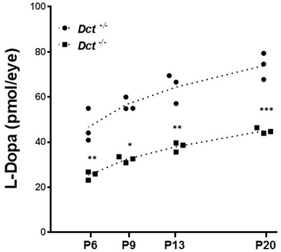 We compared the concentration of L-Dopa in postnatal eyecups of Dct+/− and Dct−/− postnatal eyes between P6 and P20, i.e., during the period of choroidal melanization (Figure 6).
