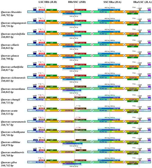 The length of the cp genome in section Cyclobalanopsis changed little, with 445 bp, ranging from 160,533 bp (Quercus acuta) to 160,978 bp (Quercus edithiae). All cp genomes in section Cyclobalanopsis were shorter than those in the other sections of Quercus. The length of the IR regions among different species in this section, Cyclobalanopsis, varied by 31 bp (Table S1).