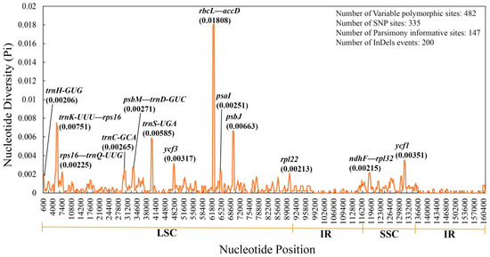 A total of 482 variation polymorphism sites, including 335 single nucleotide polymorphism sites, 147 parsimony-informative sites, and 200 indel events, were detected by nucleotide polymorphism analysis. Nucleotide polymorphism in the IR regions of the cp genome was significantly lower than that in the LSC and SSC regions. The Pi value of nucleotide diversity in the cp genomes of section Cyclobalanopsis ranged from 0 to 0.01808, with an average of 0.00059. Furthermore, the analysis detected 13 highly divergent regions (Pi > 0.002), of which eight were located in the gene regions (trnH-GUG, trnC-GCA, trnS-UGA, ycf1, ycf3, psaI, psbJ, and rpl22) and five in the intergenic spacer regions (trnK-UUU—rps16, rps16— trnQ-UUG, psbM—trnD-GUC, rbcL—accD, and ndhF—rpl32). Among the 13 divergent regions, 11 were in the LSC region, and only two were in the SSC region (Figure 3).