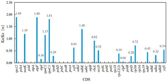 To investigate the evolutionary characteristics of Quercus section Cyclobalanopsis in the cp genome, Ka, Ks, and the Ka/Ks (ω) ratio were calculated for the CDS of the 78 shared PCGs in the 16 cp genomes. The results showed that the Ka values ranged from 0 to 0.06019, the Ks values ranged from 0 to 0.08333, and the Ka/Ks (ω) values of 37 CDS of the PCGs were significant (Ks > 0, p < 0.05, Figure 4, Table S4). The Ka/Ks (ω) values of six CDS of the PCGs (rps12, matK, atpF, rpoC2, rpoC1, and ndhK), which were distributed in the LSC region, were greater than 1, indicating that these genes had undergone positive selection. The Ka/Ks (ω) values of the other 31 CDS of the PCGs were all less than 1, suggesting that genes were under purifying selection (Figure 4, Table S4).