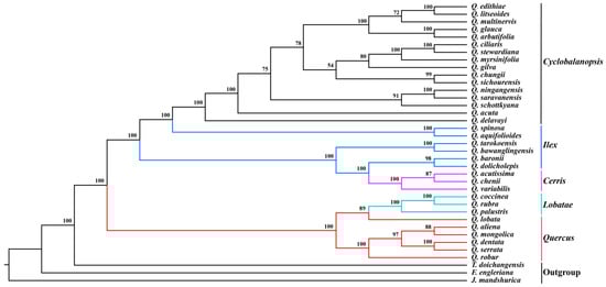 The phylogenetic study of Quercus is a great challenge because of its species richness, wide distribution, and serious hybridization introgression [6,7,10]. Our cp genome phylogenetic tree supports that sections Quercus and Lobatae formed one lineage (belonging to subgenus Quercus), and sections Cyclobalanopsis, Ilex, and Cerris formed another lineage (subgenus Cerris) [6]. Based on the RAD-seq data, section Ilex is a monophyletic lineage, whereas the phylogenetic reconstruction of the cp genome was paraphyletic. The section Cerris formed one lineage and nested into section Ilex in this study, which is also different from the phylogeny based on RAD-seq data [6].