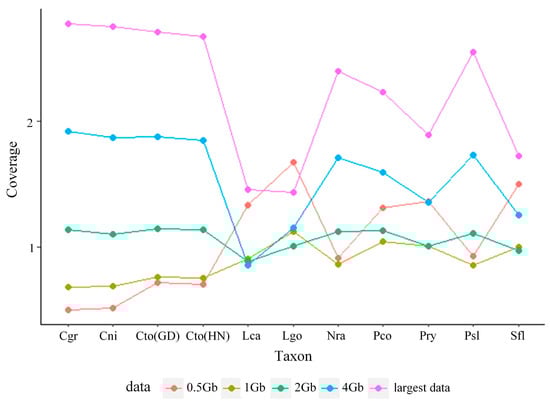 Coverage distribution of P. saccharina lanx (Psl), P. conulus (Pco), P. ryukyuensis (Pry), C. toreuma (GD) (Cto-GD), C. toreuma (HN) (Cto-HN), C. grata (Cgr), C. nigrolineata (Cni), L. goshimai (Lgo), L. cassis (Lca), N. radula (Nra), and S. flexuosa (Sfl) under different sizes of genome skims.