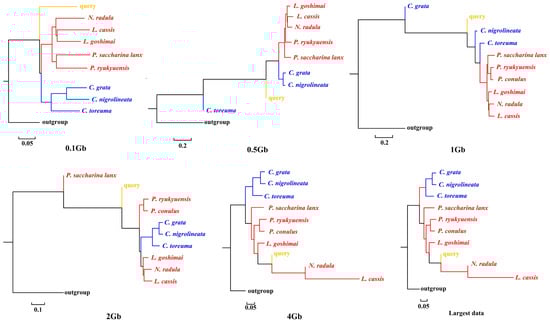 APPLES placed C. toreuma (HN) into a clade with C. toreuma (GD) except for the 0.5 Gb data (Figure 2). The phylogenetic position of S. flexuosa was variable in the results obtained based on different sizes of genome skims (Figure 3). APPLES placed S. flexuosa at or near the base of Patellogastropoda except for the phylogenetic results of 4 Gb and the largest data, which placed the query into a sister clade with L. cassis and N. radula. When P. conulus was selected as the query species, it formed a clade with P. ryukyuensis or P. ryukyuensis + L. cassis under 0.1 Gb, 0.5 Gb, and 1 Gb data, while it was sister to a clade formed by N. radula and L. cassis in the placement results based on data volumes of 2 Gb and above (Figure 4).
