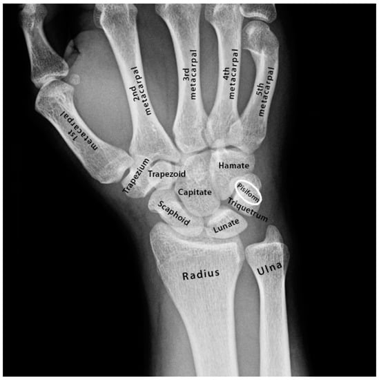 - Kjosness, K.M.; Reno, P.L. Identifying the homology of the short human pisiform and its lost ossification center. Evodevo 2019, 10, 32. [Google Scholar] [CrossRef]