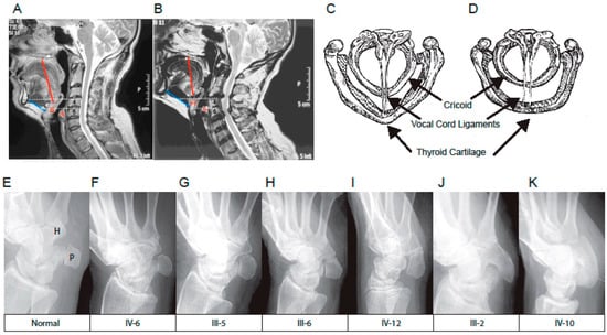 - Vocal cords that reduced their elasticity and retarded their pubertal elongation and the progressive protrusion/prominence of the thyroid cartilage that increased the severity of speech impairment in the affected family (Figure 4C,D).