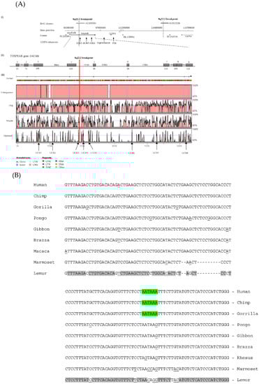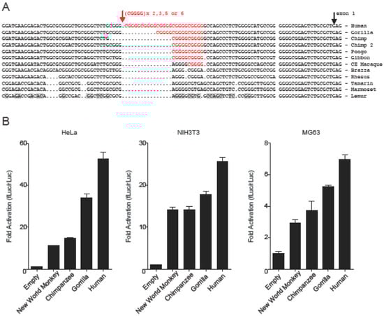 - Ohadi, M.; Valipour, E.; Ghadimi-Haddadan, S.; Namdar-Aligoodarzi, P.; Bagheri, A.; Kowsari, A.; Rezazadeh, M.; Darvish, H.; Kazeminasab, S. Core promoter short tandem repeats as evolutionary switch codes for primate speciation. Am. J. Primatol. 2015, 77, 34–43. [Google Scholar] [CrossRef] [PubMed]