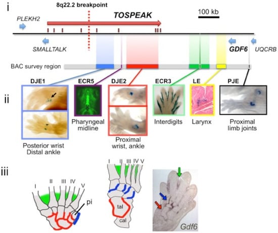 - Portnoy, M.E.; McDermott, K.J.; Antonellis, A.; Margulies, E.H.; Prasad, A.B.; Kingsley, D.M.; Green, E.D.; Mortlock, D.P. Detection of potential GDF6 regulatory elements by multispecies sequence comparisons and identification of a skeletal joint enhancer. Genomics 2005, 86, 295–305. [Google Scholar] [CrossRef]