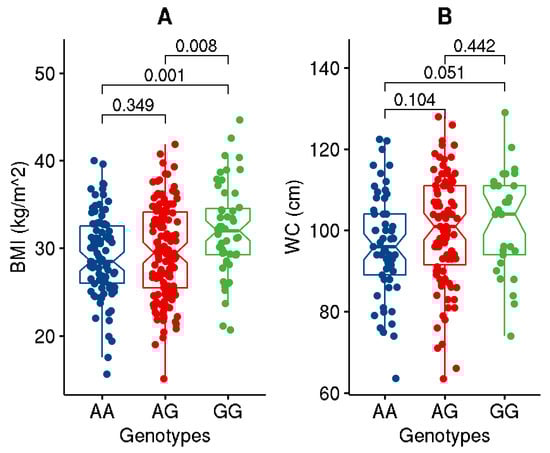 Data distribution for the levels of BMI (A) and WC (B) in individuals with genotypes homozygous for major allele (AA) versus genotypes homozygous for effect allele (GG) or for the heterozygous genotypes (AG). The boxplot illustrates minimum and maximum values in the range, first quartile, median, and third quartile for each of the genotype groups.