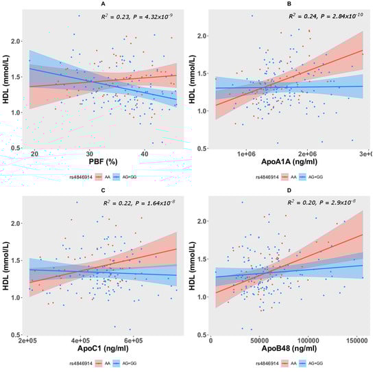 Interactions observed in HDL with PBF (negative correlation) (A), ApoA1A (B), ApoC1 (C), and ApoB48 (D) in interaction with the AG+GG carrier genotype at the study variant.
