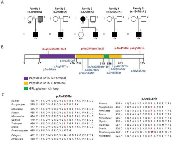 Using whole-exome sequencing, we screened for variants in unrelated patients presenting inherited optic neuropathies (ION) with a negative molecular diagnosis after analyzing OPA1, OPA3, WFS1, SPG7, AFG3L2, DNM1L, MFN2 exonic sequences, and pathogenic variants in the mitochondrial DNA responsible for LHON. After eliminating frequent (>1/10.000) and non-pathogenic variants, according to the Sift, Polyphen and Mutation-Taster prediction tools, a first heterozygous pathogenic variant was identified in PMPCA, which led to the inclusion of this gene in the ION panel. Three additional heterozygous PMPCA (NM_015160.3) variants were identified in four families (Figure 1A), two unreported and two being referenced with an allele frequency of 4.01 × 10−6 and 8.01 × 10−6 (Figure 1B, Table 1). Two variants (c.309delA and c.820delG) are pair base deletions causing a frameshift (p.(Lys103AsnfsTer74) and p.(Val274SerfsTer27)); and two are missense variants (c.1363G>A and c.1547G>A) causing the p.(Ala455Thr) and p.(Arg516His) amino-acid changes, respectively (Table 1), which are evolutionary well conserved throughout animal PMPCA sequences (Figure 1C). These variants were confirmed by Sanger sequencing and analyzed for segregation, whenever DNA samples were available (Figure 1A). The pathogenicity of the two missense PMPCA variants was assessed in silico using multiple prediction software, with results strongly supporting their deleterious and damaging effect (Table 2), although they were classified as class 3 variants by the ACMG prediction program (Table 1).
