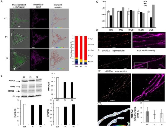 Mitochondrial dynamic and PMPCA distribution studies of fibroblasts from control and PMPCA mutated patients. (A): Representative fluorescent images of mitochondrial network structure overlaid on phase-contrast (on the left) showed a mitochondrial network hyperconnection in PMPCA fibroblasts. Mitochondrial volume (in purple on black background in the middle) was assessed using the Mitotracker Green fluorescent signal by Imaris software and color-coded on the right. The inset illustrates the classification code. To present the changes in mitochondrial morphology in patients’ cells, types of mitochondria were classified into 5 groups according to mitochondrial length: blobs < 1 μm; fragmented < 5 μm; tubular < 10 μm; filamentous < 20 μm; mitochondrial network > 20 um. Bar graphs show the distribution of the mitochondrial population of Control, P1 and P2. Mean ± SEM. Scale bar: 10 μm. (B): Western blots (left) against PMPCA, PMPCB, OPA1 and citrate synthase (CS) on control (C1) and two patients’ (P1 and P2) fibroblasts reveal decreased levels of PMPCA and equal levels of PMPCB and OPA1 in the pathological conditions, as shown on the histogram (right). (C): Enzymatic activities of the respiratory complexes (CI to CV) from the control and the PMPCA mutated fibroblast strains related to the citrate synthase (CS) enzymatic activity, did not reveal a significant difference between control and mutated fibroblasts. Biochemical data were generated using the two-tailed paired t-test. Results are Mean ± S.E.M. from four independent experiments. (D): Single-molecule localization microscopy dSTORM was used to analyze PMPCA distribution, correlated to total internal reflection fluorescence TIRF microscopy for mitochondrial staining. Using Imaris 8.0 ® software, the dSTORM PMPCA immunofluorescence signal was used to quantify their mitochondrial surface protein distribution.