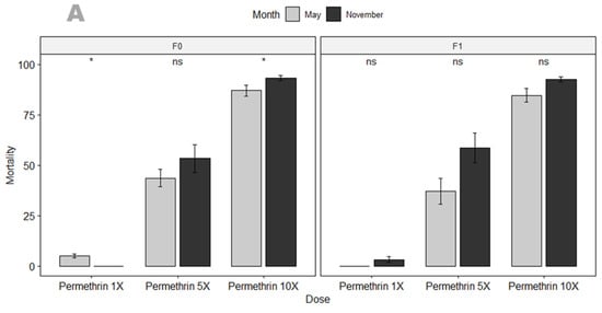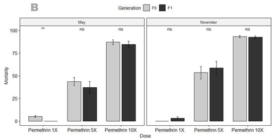 (A) Temporal variation in susceptibility profile of An. gambiae s.s. (F0 & F1) to different doses of permethrin. (B) Susceptibility profile of F0 and F1 An. gambiae s.s. to different doses of permethrin per collection time point (May & November). Recorded mortalities following 60-minute exposure of An. gambiae s.s. from Mangoum. Data are shown as mean ± standard error of the mean (SEM). Student’s test was used for comparisons. p value code: ns: p > 0.05. *: p ≤ 0.05, **: p ≤ 0.01.