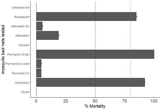 Bio-efficacy of different commercial LLINs against An. gambiae s.s. in Mangoum. Results of cone bioassays with Olyset®Net, Olyset®Plus, PermaNet®2.0, PermaNet®3.0 (side and roof), Duranet®, Royal guard®, Inteceptor® and Interceptor G2® (% Mortality 72 h). Results are average of percentage mortalities ± SEM of five replicates. Mortality < 50% (blue line): No efficient, 50% < Mortality ≤ 80%: minimal efficacy, Mortality ≥ 80% (green line): optimal efficacy.