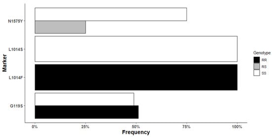 In Mangoum, the 1014F resistant allele was fixed as previously reported on the continent [,]. Polymorphic analysis of the exon 20 of the VGSC gene showed that the fixation of 1014F allele is associated with reduced genetic diversity with a predominant haplotype as reported in several studies [,]. This is evidence of extensive selection on this population in Mangoum, likely from both LLINs use and agricultural practices. Our results showed a significant association between the N1575Y mutation and pyrethroid resistance. Available data showed that the 1575Y allele conferred to mosquitoes the ability to survive to 5× deltamethrin exposure, suggesting that the increased frequency of this allele could be contributing to resistance escalation. It had been found elsewhere that N1575Y could compensate for the fitness cost incurred by the L1014F kdr mutation and provide additional pyrethroid resistance []; therefore, the frequency of this allele should be further monitored as an indicator of resistance aggravation.