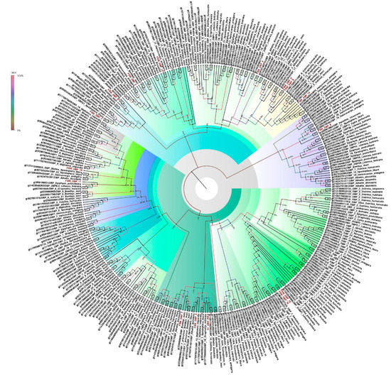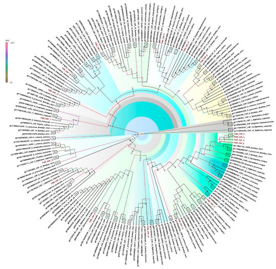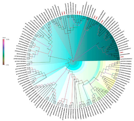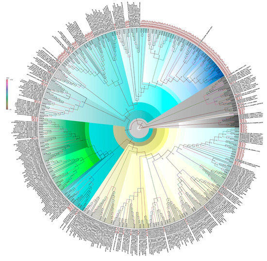 All candidate OBPs, ORs, CSPs, and SNMPs, and PBPs were manually checked by the BLASTx program at the National Center for Biotechnology Information (NCBI). For contigs with hits against genes of interest, open reading frames (ORFs) were identified and the annotation verified OBP, OR, CSP, SNMP and PBP protein sequences. Orthologs in closely related species of E. materna were used to analyze the characteristics of olfactory genes in E. materna. Nucleotide sequences of all olfactory genes that were identified from the E. materna antennal transcriptomes were named according to sequence homology analysis and numbered arbitrarily. The proteins were aligned using MUSCLE [44] and phylogenetic analysis was done with MEGA using the maximum likelihood method. The test of phylogeny was done using the bootstrap method with 500 replications. The method followed was the Jones–Taylor–Thornton (JTT) model. The tree with the highest log likelihood is shown. The percentage of trees in which the associated taxa clustered together is shown next to the branches is the support value for the cluster. The initial tree(s) for the heuristic search were obtained automatically by applying the Neighbor-Join and BioNJ algorithms to a matrix of pairwise distances estimated using a JTT model, and then selecting the topology with a superior log likelihood value. The tree is drawn to scale, with branch lengths measured in the number of substitutions per site. This analysis involved 200 amino acid sequences and there was a total of 638 positions in the final dataset for the FSMCSP tree, 342 amino acid sequences with a total of 796 positions in the final dataset for the FSMOBP tree, 530 amino acid sequences and a total of 1043 positions in the final dataset for the FSMOR tree, and 27 amino acid sequences and a total of 544 positions in the final dataset for FSMSNMP. For the FSMPB tree, this analysis involved 94 amino acid sequences with a total of 178 positions in the final dataset. Evolutionary analyses were conducted in MEGA X [45]. The Newick tree generated was then transferred to Fig Tree 4 (available from http://tree.bio.ed.ac.uk/software/figtree/, accessed on 29 June 2022) using the bootstrap values for further analysis and figure preparation. The branches were assigned a color based on the clade and the radial phylogeny was obtained. A bootstrap analysis of 500 iterations was performed to evaluate the branch strength of each tree. The support values represented on the branches for a cluster are in percentages based on the bootstrap values. They signify the number of times the cluster was generated in a specified number of iterations. In this case, it would be 500.