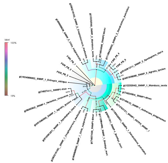 Neighbor-joining dendrogram based on protein sequences of candidate sensory neuron membrane proteins (SNMPs) in fruit-sucking moth (FSM) E. materna. Phylogenetic analysis of E. materna (red) and several related lepidopteran species SNMPs was done using the NJ method. The distances generated are based on the bootstrap values. The tree with the highest log likelihood is shown. The percentage of trees in which the associated taxa clustered together is shown next to the branches. FSM SNMPs show diversification from each other and other lepidopterans. The colors used were to make the clades more prominent and do not bear any significance to the clustering. Confidence values for each tree are represented as percent values next to the cluster. Values greater than 50% would be considered to have higher confidence levels.