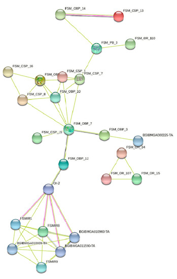 To perform the STRING analysis of the FSM olfactory proteins, the translated sequences of the transcripts identified from the antennal transcriptome of FSMs were submitted online using the freely available tool at https://string-db.org/, accessed on 1 June 2021. The scoring parameters are described in [46]. The resulting network was analyzed using the Bombyx mori L. genome as the reference. The interactions were obtained and interpreted based on the legends provided in the database. A medium confidence level of 0.4 was used for the settings. The non-interacting nodes were then removed to obtain a clear picture of the interactions.