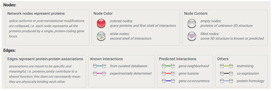 - Von Mering, C.; Jensen, L.J.; Snel, B.; Hooper, S.D.; Krupp, M.; Foglierini, M.; Jouffre, N.; Huynen, M.A.; Bork, P. STRING: Known and Predicted Protein–protein Associations, Integrated and Transferred Across Organisms. Nucleic Acids Res. 2005, 33, D433–D437. [Google Scholar] [CrossRef] [PubMed]