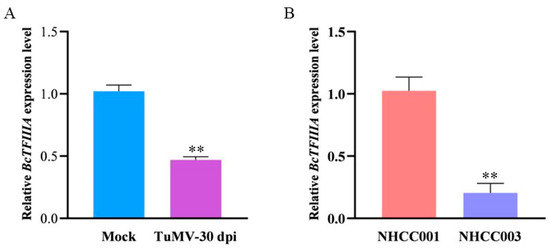 The expression levels of BcTFIIIA in various plants. (A) Analysis of BcTFIIIA mRNA levels by qRT-PCR in mock (buffer-infected) and TuMV-30 dpi (TuMV-infected 30 dpi) in 49CX. (B) Analysis of BcTFIIIA mRNA levels in resistant variety NHCC001 and sensitive variety NHCC003 by qRT-PCR. Three plants were used in this experiment. Significant differences were determined by Student’s t-test, ** p < 0.01.