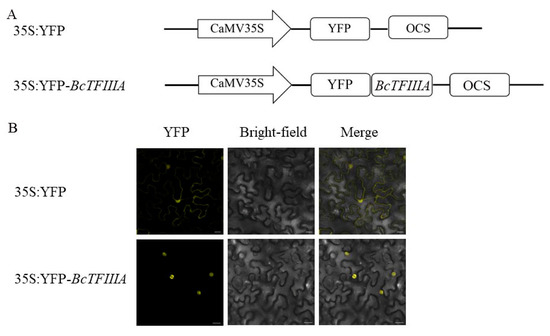 Online analysis in silico (https://wolfpsort.hgc.jp/, accessed on 10 October 2020) indicated that BcTFIIIA might be located in the nucleus. To demonstrate this, we fused BcTFIIIA with 35S:YFP to create a construct (35S: YFP-BcTFIIIA), with vector 35S:YFP serving as a control (Figure 4A). Using Agrobacterium -mediated transformation in tobacco epidermal cells, these two constructs were momentarily expressed. When the control vector was employed, we noticed that the YFP signal was uniformly distributed throughout the nucleus and cytoplasm of epidermal cells. However, only cells producing fusion protein YFP–BcTFIIIA had the fluorescence signal visible in their nucleus (Figure 4B), which indicated that BcTFIIIA targeted to the nucleus. The presence of full-length recombinant proteins was confirmed by Western blotting (WB) with a GFP antibody (@GFP) (Figure S1), which revealed the predicted and precise band corresponding to the YFP–BcTFIIIA and YFP proteins.