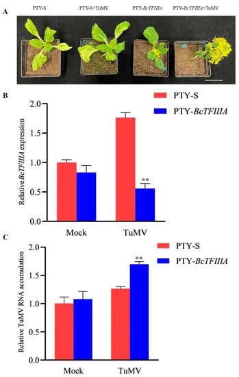 Silencing of BcTFIIIA promotes TuMV infection in 49CX. (A). Plant images were taken at 20 dpi. The 49CX was preinjected with PTY-S (control), PTY-BcTFIIIA (to silence the BcTFIIIA) for 10 days, and then injected with TuMV-GFP for 20 days. Bar scale, 5 cm. (B). The level of BcTFIIIA expression in these plants. RNA was isolated from systemically infected leaves at 20 dpi. (C). TuMV RNA accumulation in these plants. Three plants and three experiments were analyzed in this study. Significant differences were determined by Student’s t-test, ** p < 0.01.
