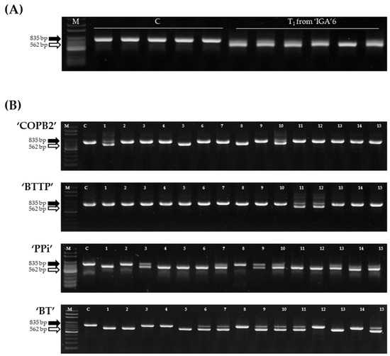 The activation analysis of the PTE-2 by MIP PCR analysis. (A) MIP PCR analysis of the PTE-2 in the control line, ‘CT001’ and the ‘IGA’ transgenic lines. M, 100 bp DNA ladder; C, ‘CT001’; lane, ‘IGA’ transgenic lines of the T1 generation advanced from ‘IGA’6. (B) MIP PCR analysis of the PTE-2 in the control line, ‘CT001’ and four transgenic lines (‘COPB2’, ‘BTTP’, ‘PPi’, and ‘BT’). M, 100 bp DNA ladder; C, ‘CT001’; Lane, the transgenic lines. Black arrow, PTE-2-inserted amplicon; White arrow, PTE-2-excised amplicon.