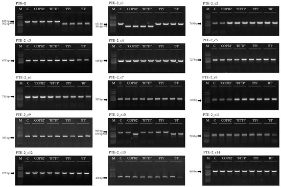 MIP PCR analysis was conducted on transgenic lines that were identified to be activated. The PCR results of copy elements were compared to the loci of PTE-2 activated in the transgenic lines (Figure 5). Among the PTE-2 copy elements, PTE-2_c1 was activated in ‘COPB2’ and ‘BTTP’ transgenic lines and PTE-2_c10 was activated in ‘COPB2’ and ‘BT’ transgenic lines (Figure 5). In conclusion, although the copy elements had identical sequences, only a few copies were activated, and the activation tendencies were different.