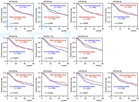 The sequences of the miR-30 family were confirmed using miRbase ver. 22.1 (https://www.mirbase.org, accessed on 10 July 2020) [18]. TCGA-HNSC (TCGA, Firehose Legacy) was used to investigate the clinical significance of miRNAs and their target genes. Clinical parameters and gene expression data were obtained from cBioPortal (http://www.cbioportal.org/, data downloaded on 20 August 2020) and OncoLnc (http://www.oncolnc.org/, data downloaded on 20 August 2020) [19,20,21].
