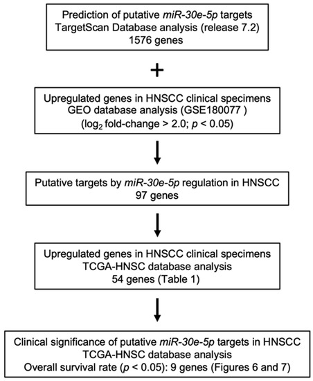 To identify genes modulated by miR-30e-5p that were closely involved in HNSCC molecular pathogenesis, we performed in silico database analyses combined with our gene expression data. We created new gene expression data using clinical specimens of hypopharyngeal squamous cell carcinoma (HSCC). Three HSCC tissues, three normal hypopharyngeal tissues, and two cervical lymph nodes harvested from one HSCC patient who underwent surgical resection at Chiba University Hospital were subjected to Agilent whole genome microarrays. In this study, we compared gene expressions in cancer tissues with those in normal tissues. The clinical information of this patient was summarized in Table S1. Expression data were deposited in the GEO database (accession number: GSE180077). Our selection strategy is shown in Figure 5.