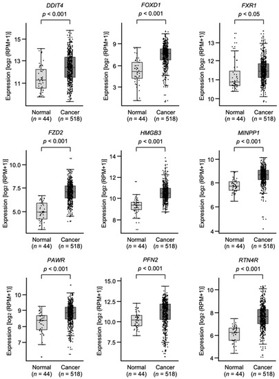 Expression levels of nine target genes (DDIT4, FOXD1, FXR1, FZD2, HMGB3, MINPP1, PAWR, PFN2, and RTN4R) in HNSCC clinical specimens from TCGA-HNSC. All genes were found to be upregulated in HNSCC tissues (n = 518) compared with normal tissues (n = 44).