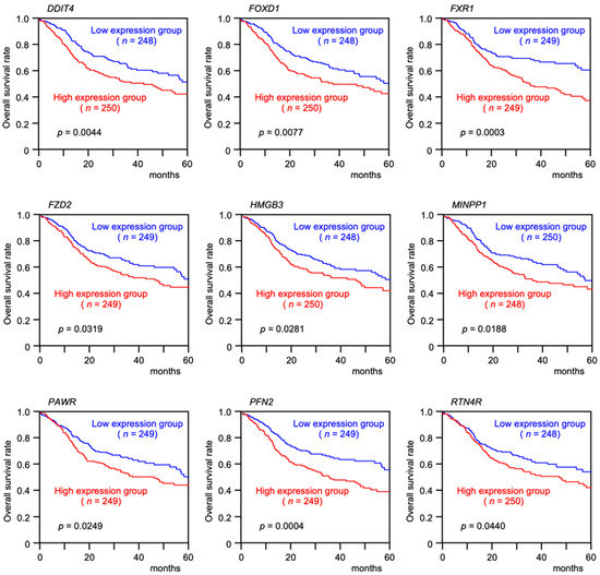 Clinical significance of nine target genes (DDIT4, FOXD1, FXR1, FZD2, HMGB3, MINPP1, PAWR, PFN2, and RTN4R) according to TCGA-HNSC data analysis. Kaplan–Meier curves of the 5-year overall survival rates according to the expression of each gene are presented. High expression levels of all nine genes were significantly predictive of a poorer prognosis in patients with HNSCC. Patients were divided into two groups according to the median gene expression level: high and low expression groups. The red and blue lines represent the high and low expression groups, respectively.