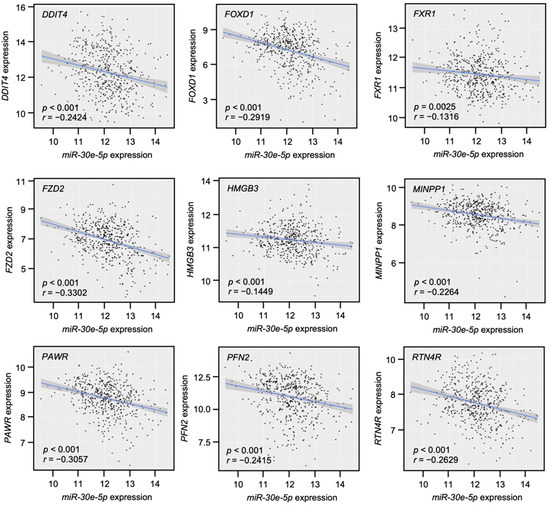 The correlations of the expression levels between these nine genes and miR-30e-5p were evaluated by TCGA-HNSC. A Spearman’s rank test confirmed weak negative correlations in seven genes (DDIT4, FOXD1, FZD2, MINPP1, PAWR, PFN2, and RTN4R) (p < 0.001, r < −0.2, Figure 8), whereas the correlations were not confirmed in FXR1 and HMGB3.