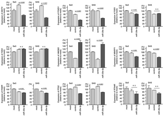 Regulation of the expression of nine genes by miR-30e-5p in HNSCC cells. qRT-PCR showing significantly reduced expression of FOXD1 mRNA (top, middle) 72 h after miR-30e-5p transfection in Sa3 and SAS cells (N.S.: not significant compared to control group).