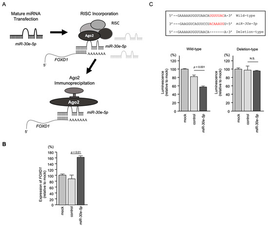 To confirm incorporation of FOXD1 mRNA into RISC, RIP assays were performed (Figure 10A,B). The schematic illustration displays the concept of RIP assays. Ago2-bound miRNA and mRNA were isolated by the immunoprecipitation of Ago2, the protein that plays a central role in RISC (Figure 10A). Using samples isolated by immunoprecipitation, qRT-PCR showed that the FOXD1 mRNA level was significantly higher than those of mock or miR control transfected cells (p < 0.01; Figure 10B), suggesting a significant incorporation into RISC.