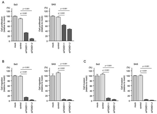 The knockdown of FOXD1 slightly inhibited Sa3 and SAS cell proliferation (Figure 12A). In contrast, cell migration and invasion were significantly inhibited after siFOXD1-1 and siFOXD1-2 transfection into Sa3 and SAS cells (Figure 12B,C). Photographs of typical results from the migration and invasion assays are shown in Figure S3.