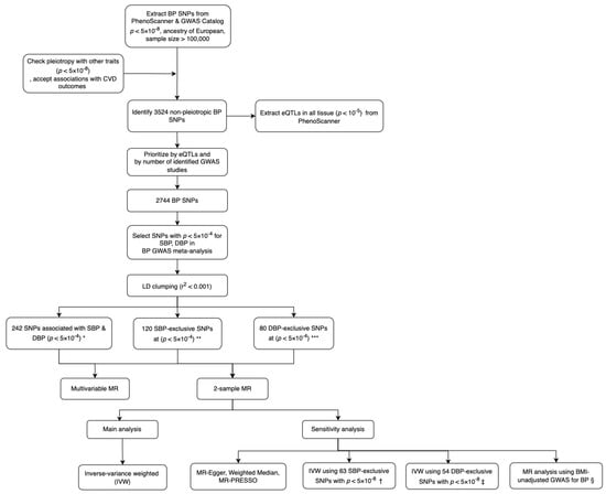 Flowchart illustrating the selection criteria for genetic instruments in this study. BP indicates blood pressure; SBP, systolic blood pressure; DBP, diastolic blood pressure; SNP, single nucleotide polymorphism; GWAS, Genome-wide association study; CVD, cardiovascular disease; eQTL, expression quantitative trait loci; LD, linkage disequilibrium; MR, Mendelian randomization; BMI, body mass index. * 242 SNPs associated with both SBP and DBP (p < 5 × 10−4), identified in a BP GWAS meta-analysis study [17]. ** 120 SNPs associated with SBP but not associated with DBP (p < 5 × 10−4). *** 80 SNPs associated with DBP but not associated with SBP (p < 5 × 10−4). † 63 SNPs associated with SBP (p < 5 × 10−8) but not associated with DBP (p > 5 × 10−4). ‡ 54 SNPs associated with DBP (p < 5 × 10−8) but not with SBP (p > 5 × 10−4). § MR analysis unadjusted for body mass index, using summary statistics from UK BioBank data.