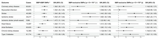 The following are available online at https://www.mdpi.com/article/10.3390/genes13071226/s1, Supplementary Checklist: STROBE-MR checklist of recommended items to address in reports of Mendelian randomization studies; Figure S1: Scatter plots for MR analyses of the causal effect of systolic blood pressure on (a) atrial fibrillation, (b) coronary artery disease, (c) myocardial infarction, (d) stroke, (e) ischemic stroke, (f) ischemic stroke (small-vessel), (g) heart failure, (h) chronic kidney disease, (i) type 2 diabetes, using inverse-variance weighted, weighted median, and MR Egger methods; Figure S2: MR-Egger regression funnel plots for systolic blood pressure on (a) atrial fibrillation, (b) coronary artery disease, (c) myocardial infarction, (d) stroke, (e) ischemic stroke, (f) ischemic stroke (small-vessel), (g) heart failure, (h) chronic kidney disease, (i) type 2 diabetes; Figure S3. Scatter plots for MR analyses of the causal effect of diastolic blood pressure on (a) atrial fibrillation, (b) coronary artery disease, (c) myocardial infarction, (d) stroke, (e) ischemic stroke, (f) ischemic stroke (small-vessel), (g) heart failure, (h) chronic kidney disease, (i) type 2 diabetes, using inverse-variance weighted, weighted median, and MR Egger methods; Figure S4: MR-Egger regression funnel plots for diastolic blood pressure on (a) atrial fibrillation, (b) coronary artery disease, (c) myocardial infarction, (d) stroke, (e) ischemic stroke, (f) ischemic stroke (small-vessel), (g) heart failure, (h) chronic kidney disease, (i) type 2 diabetes; Figure S5: Leave-one-out plots for MR analyses of the causal effect of systolic blood pressure on (a) atrial fibrillation, (b) coronary artery disease, (c) myocardial infarction, (d) stroke, (e) ischemic stroke, (f) ischemic stroke (small-vessel), (g) heart failure, (h) chronic kidney disease, (i) type 2 diabetes, using inverse-variance weighted, weighted median, and MR Egger methods; Figure S6: Leave-one-out plots for MR analyses of the causal effect of diastolic blood pressure on (a) atrial fibrillation, (b) coronary artery disease, (c) myocardial infarction, (d) stroke, (e) ischemic stroke, (f) ischemic stroke (small-vessel), (g) heart failure, (h) chronic kidney disease, (i) type 2 diabetes, using inverse-variance weighted, weighted median, and MR Egger methods; Figure S7: Scatter plots for MR analyses of the independent causal effect of systolic blood pressure on (a) atrial fibrillation, (b) coronary artery disease, (c) heart failure, (d) stroke, (e) ischemic stroke, (f) ischemic stroke (small-vessel), (g) type 2 diabetes, using inverse-variance weighted, weighted median, and MR Egger methods; Figure S8: Scatter plots for MR analyses of the independent causal effect of diastolic blood pressure on (a) myocardial infarction, (b) stroke, (c) ischemic stroke, (d) ischemic stroke (small-vessel) using inverse-variance weighted, weighted median, and MR Egger methods; Figure S9: MR-Egger regression funnel plots for systolic blood pressure on (a) atrial fibrillation, (b) coronary artery disease, (c) heart failure, (d) stroke, (e) ischemic stroke, (f) ischemic stroke (small-vessel), (g) type 2 diabetes, using systolic blood pressure-exclusive SNPs; Figure S10: MR-Egger regression funnel plots for diastolic blood pressure on (a) myocardial infarction, (b) stroke, (c) ischemic stroke, (d) ischemic stroke (small-vessel), using diastolic blood pressure-exclusive SNPs; Table S1: SBP-and-DBP-associated SNPs included in the Mendelian randomisation analysis for SBP; Table S2: SBP-and-DBP-associated SNPs included in the Mendelian randomisation analysis for DBP; Table S3: SBP-exclusive SNPs included in the Mendelian randomization analysis for SBP; Table S4: DBP-exclusive SNPs included in the Mendelian randomization analysis for DBP; Table S5. SBP-exclusive SNPs included in the sensitivity analysis for SBP; Table S6. DBP-exclusive SNPs included in the sensitivity analysis for DBP; Table S7: Mendelian randomization estimates of systolic blood pressure (per 10 mmHg) on cardiovascular outcomes using SBP-and-DBP-associated SNPs; Table S8: Mendelian randomization estimates of diastolic blood pressure (per 5 mmHg) on cardiovascular outcomes using SBP-and-DBP-associated SNPs; Table S9: Cochran’s Q test results in 2-sample Mendelian randomisation analyses of systolic blood pressure on outcomes using SNPs associated with both systolic blood pressure and diastolic blood pressure as genetic instruments; Table S10: Cochran’s Q test results in 2-sample Mendelian randomisation analyses of diastolic blood pressure on outcomes using SNPs associated with both systolic blood pressure and diastolic blood pressure as genetic instruments; Table S11: Mendelian randomization estimates of systolic blood pressure (per SD increment) on cardiovascular outcomes using genetic associations with blood pressure unadjusted for body mass index (using SBP+DBP SNPs as genetic instruments); Table S12: Mendelian randomization estimates of diastolic blood pressure (per SD increment) on cardiovascular outcomes using genetic associations with blood pressure unadjusted for body mass index (using SBP+DBP SNPs as genetic instruments); Table S13: Mendelian randomization estimates of systolic blood pressure (per 10 mmHg) on cardiovascular outcomes using SBP-exclusive SNPs; Table S14: Mendelian randomization estimates of systolic blood pressure (per SD increment) on cardiovascular outcomes using genetic associations with blood pressure unadjusted for body mass index (using SBP-exclusive SNPs as genetic instruments); Table S15: Mendelian randomization estimates of diastolic blood pressure (per 5 mmHg) on cardiovascular outcomes using DBP-exclusive SNPs; Table S16: Mendelian randomization estimates of diastolic blood pressure (per SD increment) on cardiovascular outcomes using genetic associations with blood pressure unadjusted for body mass index (using DBP-exclusive SNPs as genetic instruments).