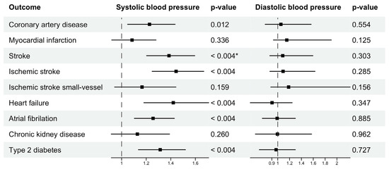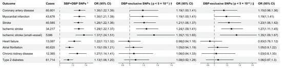 Multivariable Mendelian randomization estimates (odds ratio with 95% confidence interval per 10 mmHg increase in genetically predicted systolic blood pressure, and per 5 mmHg increase in genetically predicted diastolic blood pressure) using systolic-blood-pressure-exclusive and diastolic-blood-pressure-exclusive SNPs as genetic instruments. * p-value of 0.004 is the Bonferroni-corrected p-value in this study.