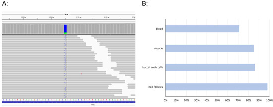 MtDNA sequencing in blood revealed a heteroplasmic variant m.8315A>C in the MTTK gene. To further assess the variant, several tissues, including muscle biopsy, were collected, and mutation loads were determined. The highest level of heteroplasmy was found in hair follicles > 96%, followed by 86% in buccal swab cells, 85% in muscle, and 71% in blood leucocytes (Figure 1).