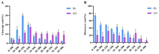 Cleavage and blastocyst rate of embryos cleaved at different times after parthenogenetic activation (PA) or in vitro fertilization (IVF) with four repetitions. (A) Cleavage rate of porcine PA and IVF embryos. (B) Blastocyst rate of porcine PA and IVF embryos.