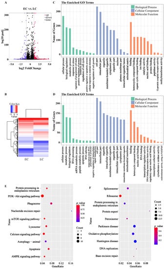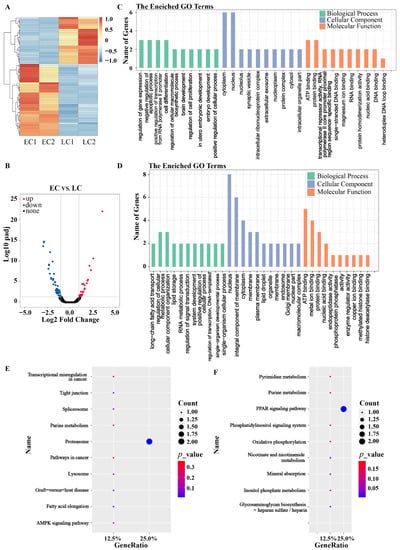 For IVF embryos, there were 71 DEGs (|log2FC| ≥ 1, FDR < 0.05) between the EC and the LC embryos, including 43 significantly upregulated and 28 downregulated genes (Figure 4A,B). GO analysis showed that the DEGs were mainly enriched in gene expression and transcription-related terms, which showed positive regulation of cellular processes and negative regulation of apoptotic processes (Figure 4C,D). KEGG analysis presented that the DEGs were enriched in the proteasome, lysosome, and in the oxidative phosphorylation and PPAR signaling pathways (Figure 4E,F). Among them, the proteasome is one of the main degradation pathways of misfolded proteins and other useless cellular proteins during protein synthesis, which may be one of the key reasons caused embryonic retardation.